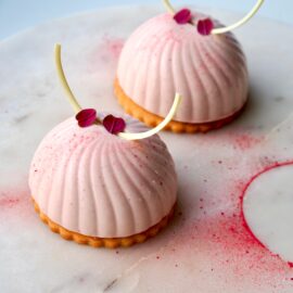 Et forslag til nytårsdesserten eller til en anden festlig lejlighed! 6 små kager bestående af hindbærgelé, vanilje-lime mousse, hindbærmousse med hvid chokolade og mørdejsbunde. De er pyntet med eller uden hindbærglaze, chokolade snirker, hindbærstøv, sølv støv og røde skovsyrer. Jeg er ret vild med det naturlige ved hindbærglaze og samtidig er det bare super nemt at arbejde med! Kagerne kan også ...